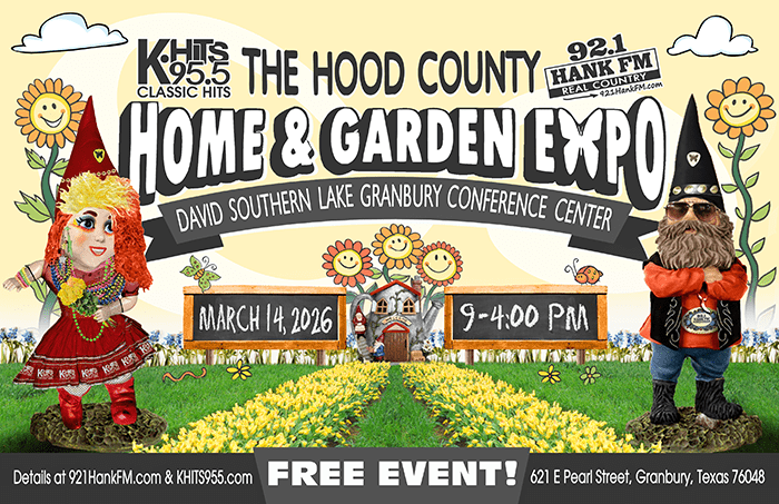 Get inspired, get ideas, and get your home ready for what’s next at the Hood County Home & Garden Expo presented by 95.5 K-Hits and 92.1 Hank FM! Join us Saturday, March 14th 9am – 4pm at the beautiful David Southern Lake Granbury Conference Center for a full day of home improvement inspiration, expert advice, and great giveaways all with FREE admission and FREE parking.