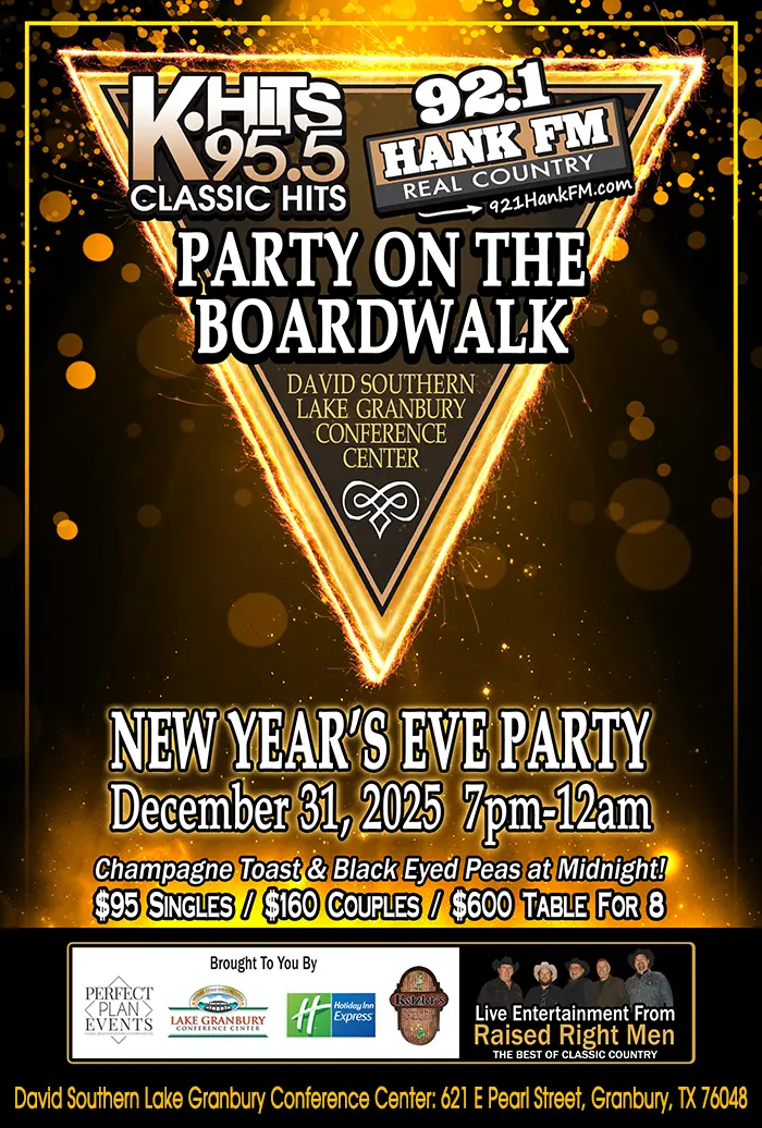Ring in 2026 with K-HITS 95.5 & our sister station 92.1 Hank FM’s New Year’s Eve Party on the Boardwalk at the David Southern Lake Granbury Conference Center 7pm – Midnight! Enjoy a night of great music from Raised Right Men, dancing, food and fun. Plus we’ve got the blackeyed peas and a champagne toast ready for midnight. Get your tickets and book your room now at Holiday Inn Express in Granbury!
