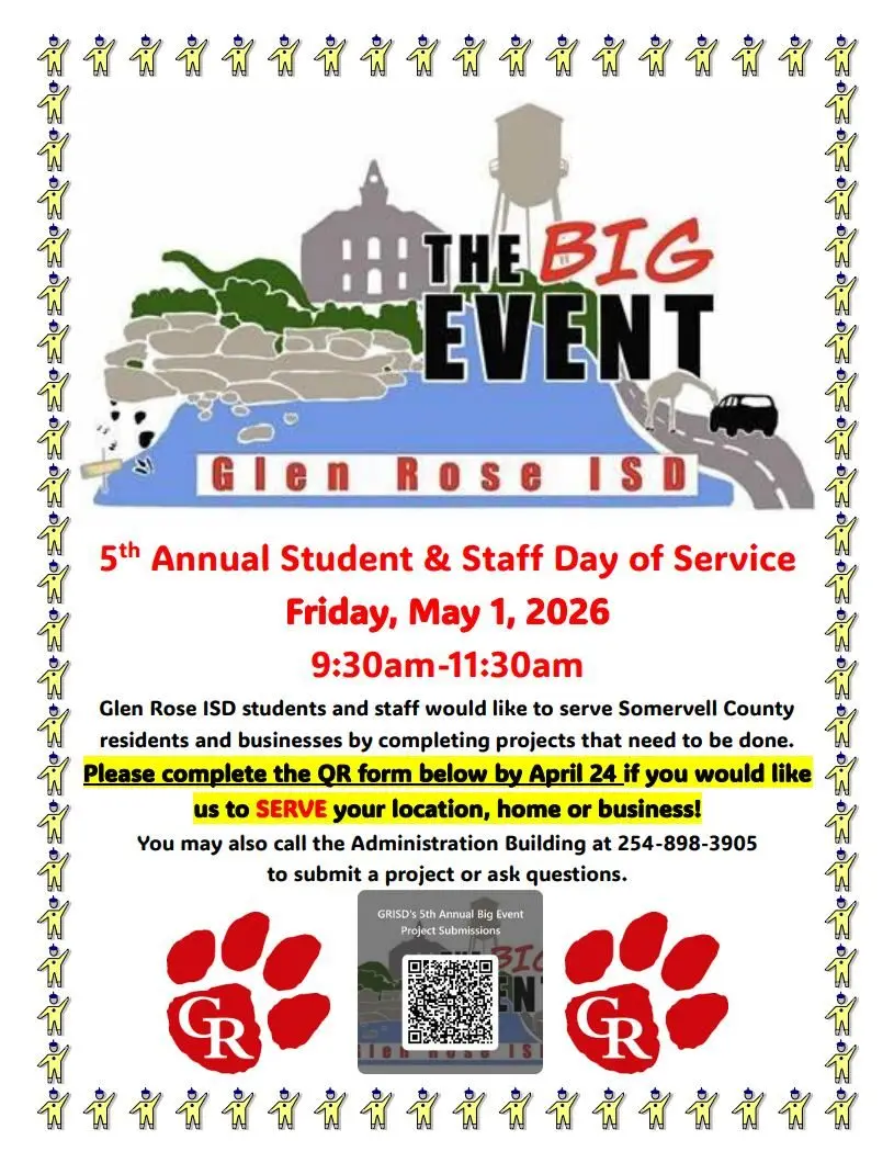 Glen Rose ISD is hosting its 5th Annual Student & Staff Day of Service on Friday, May 1, 2026, from 9:30 AM to 11:30 AM. Students and staff will volunteer throughout Somervell County to complete various community projects for local residents and businesses. Those interested in requesting service at their location should submit a project via the QR form or call the Administration Building at 254-898-3905 by the April 24 deadline.
